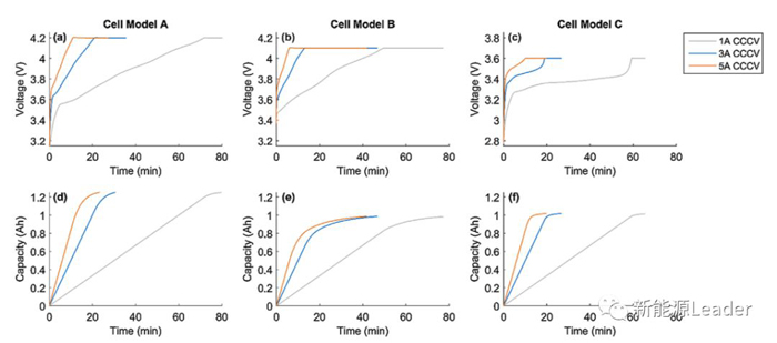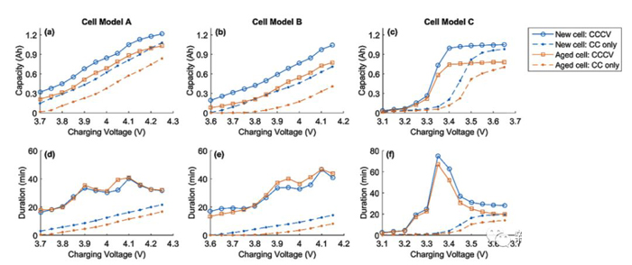 所謂的加速充電模式是在CCCV充電模式的基礎(chǔ)上增加了一個大電流的CC或者恒功率充電過程,從而達到降低充電時間的目的(如下圖e所示),有研究表明加速充電模式能夠有效的提升鋰電池的充電效率,同時又不會對鋰電池的循環(huán)壽命產(chǎn)生顯著的影響。